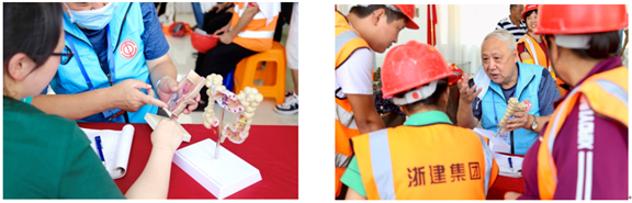 7月29日上午, 杭州市下城区工会自愿服务队树立:杭州医博肛泰医院自愿服务队为浙建集团工人送健康、送服务。